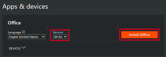 - In the Version drop-down, click on 64-bit, and then click the Install Office button.