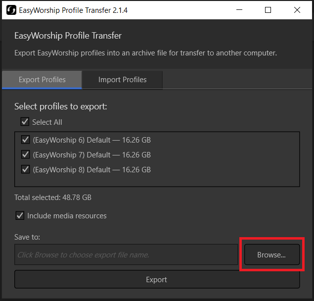 - Browse to the flash drive you are backing up to and open the EasyWorship Profile Transfer tool.