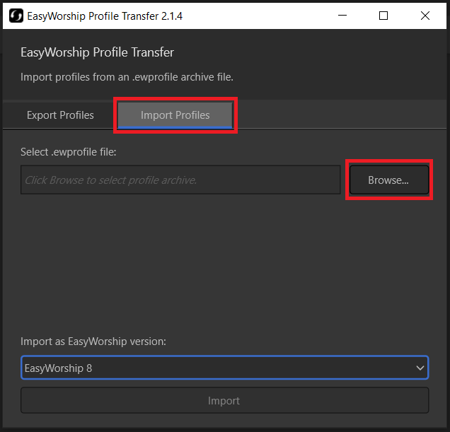 - Select what version of EasyWorship you are importing into and click Import. Close the window when it is complete.